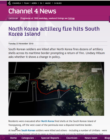 On 23rd Nov 2010, ITN's flagship prime-time programme Channel 4 News led with a dramatic headline - "The most severe exchange of fire between North and South Korea since the war ended in 1953..."