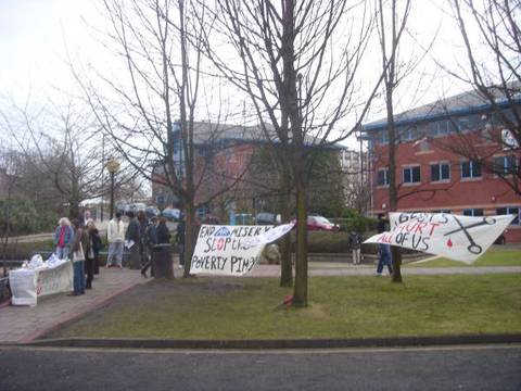 Around 15 protesters gathered outside A4e, on a soulless business park in Newcastle. We hung up banners saying "Benefit cuts hurt all of us", "End A4e misery - Stop the poverty pimps", and "Defend welfare rights" from nearby trees, set up a stall, and played music. This attracted the attention of several of the people inside the building who shouted out from the windows "nice one, are you here for long?". It also attracted the attention of A4e security and managers who had a hissy fit about a banner being tied to a tree and called the police on us.