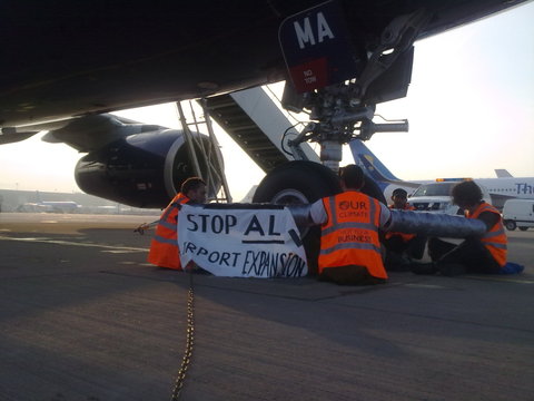 In May 2010, seventeen people took direct action at Manchester Airport, temporarily shutting it down. They did this to stop some of the 5 million tonnes of carbon emissions that the airport is responsible for annually and in opposition to plans to destroy family homes and biodiversity spots to expand the World Freight Centre. The 'Manchester Airport on Trial' campaign is being run to support the activists during their court case and to continue to oppose the airport's plans to become the 'Heathrow of the North' by 2050. Six defendants are pleading not guilty to the charge of aggravated trespass. They will argue that their actions were necessary to prevent emissions and will call expert witnesses to examine the impacts of aviation and climate change both locally and in terms of public health. The defendants will state that their actions were further justified given the failings and corruption of the decision-making processes at a Parliamentary and local authority level.