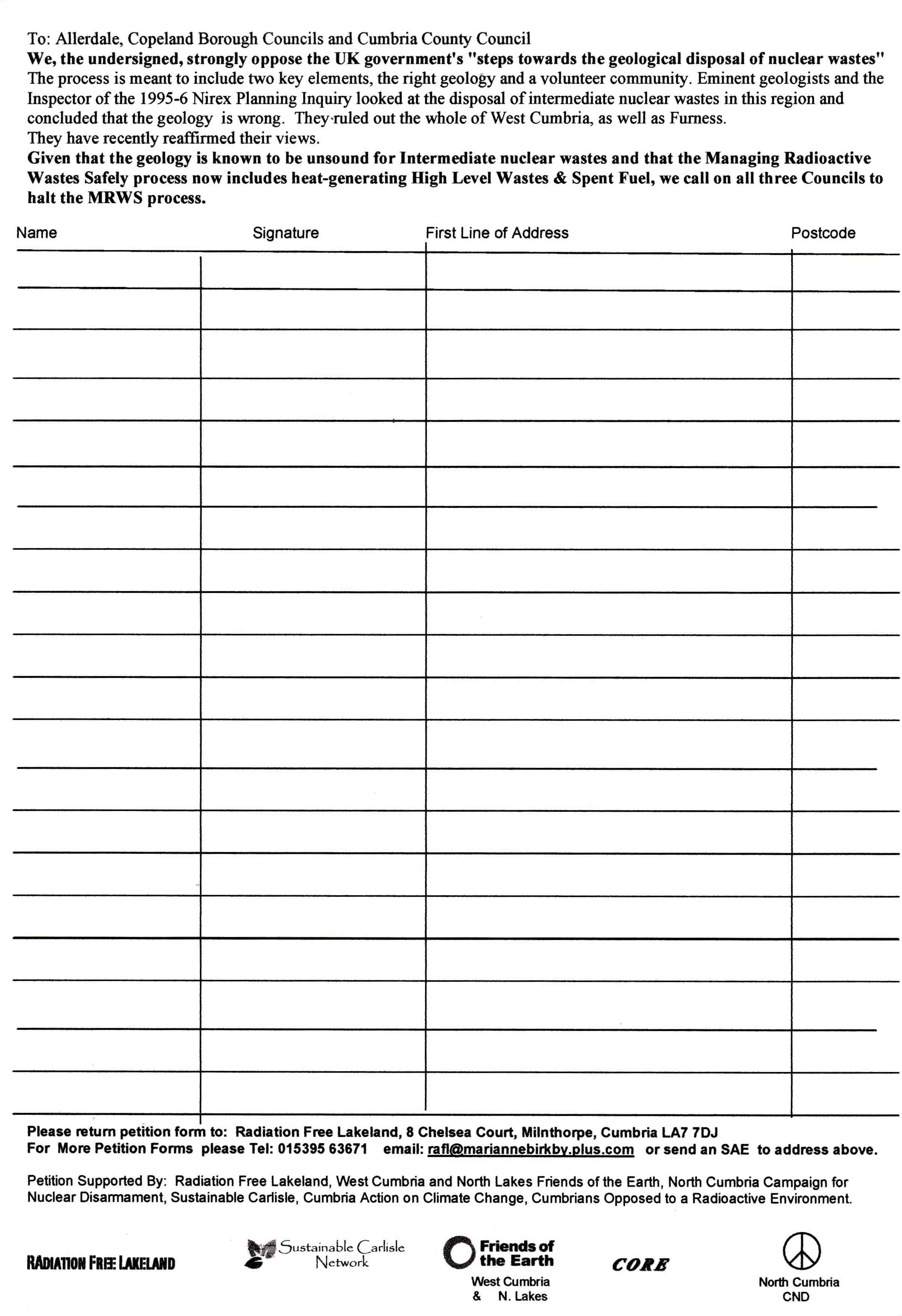 We, the undersigned, strongly oppose the UK government's "steps towards the geological disposal of nuclear wastes" The process is meant to include two key elements, the right geology and a volunteer community. Eminent geologists and the Inspector of the 1995-6 Nirex Planning Inquiry looked at the disposal of intermediate nuclear wastes in this region and concluded that the geology is wrong. They ruled out the whole of West Cumbria, as well as Furness. They have recently reaffirmed their views.