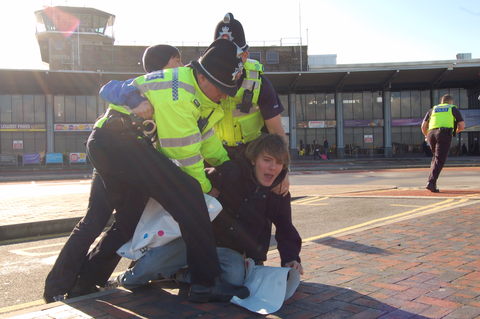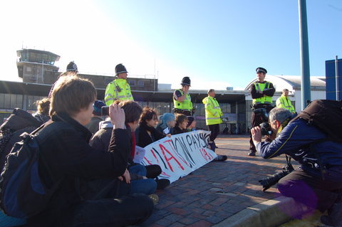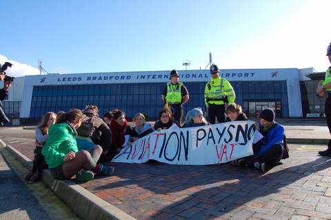Around 20 protesters targeted Leeds/Bradford airport today in a protest about tax avoidance. The protesters made their journey by bus but were stopped by police as soon as they arrived at the airport. Many made a run for the terminal and a few scuffles with police broke out. Eventually they managed to sit down together to make their point heard outside the main terminal building.