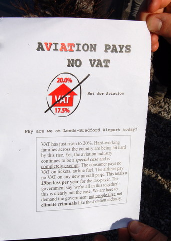 In London, one-hundred campaigners descended upon terminal 3 at Heathrow Airport to highlight the fact that the aviation industry pays no VAT. In a protest modelled on those recently seen at Oxford Street stores like Vodaphone and Top Shop, activists from Plane Stupid and other direct action groups ran around terminal 3 ‘confiscating’ items.