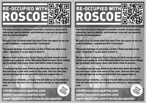Also, across the Penines, students have been in occupation at the University of Manchesters Roscoe Lecture theatre for over a month now and are preparing to wind down the occupation in order to join in with the March for the alternative actions that will be happening in London this Saturday, March 26th.