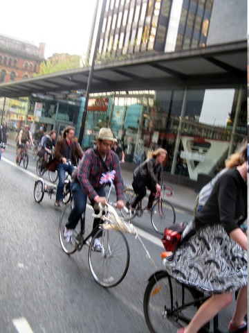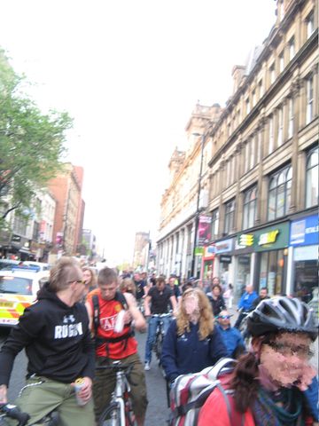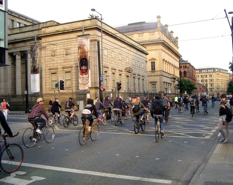 Friday's Critical Mass in Manchester was short but sweet. Around fifty cyclists set of from the library at 6:30 with bells and smiles. They then cycled round the city for an hour and but soon ended up joining the street party in Hulme.