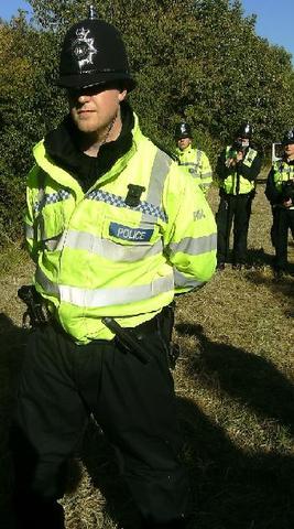 The police on the day did not let the protesters go down to the farm and the protest was a static demo away from both the farm and the village. You used an unmanned drone to observe the demo as well as lines of cops and police vans all around us. While it has been argued in the past that drones would be used to limit police numbers the number of police was huge. You drew a line on the path and wouldn't let anyone past it. One officer even moved people back whose shoes were slightly over the line another pushed someone back without even asking the protester to move!