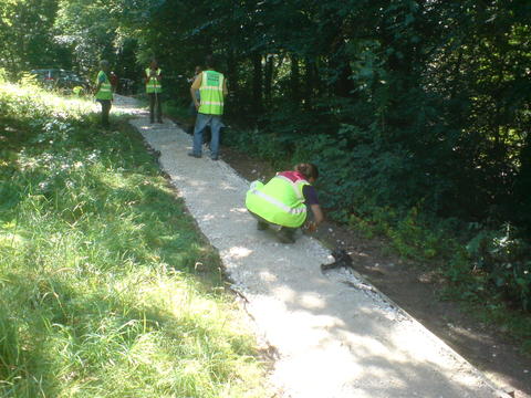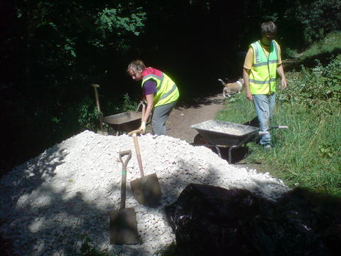 As well as clearing the meadow today, a few of us went litter-picking, someone worked on controlling the Himalayan Balsam, and a team of us built a stretch of path. The reason for building the path was that before there was just packed earth, which is OK in dry weather but when it rains, the path gets very muddy: people try to avoid walking through the muddy puddles, so they walk along the edge of the path, with the result that it gets wider and wider as people try to avoid the mud. As the path is heavily used, this could result in severe erosion if unchecked.