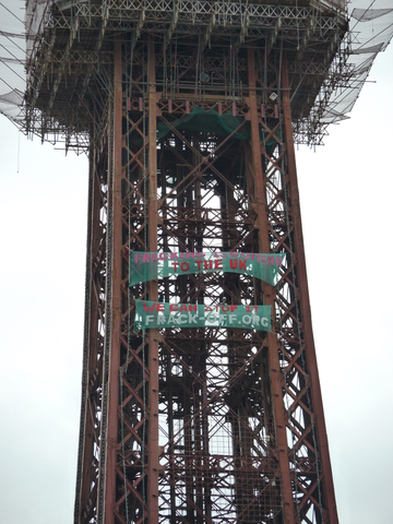 Early Saturday morning anti-fracking [1] campaigners climbed 500 feet to hang two banners [2] from the iconic Blackpool Tower raising awareness about the dangers of hydraulic fracturing for shale gas spreading to the UK. The two climbers was were later arrested by police when they descended, but not before having their lives risked by Blackpool Tower workers who attacked them with a pressure washer while they dangled hundreds of feet above the ground.