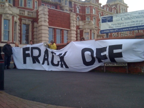 Anti-fracking protesters congregate outside the press conference in Blackpool held by Cuadrilla Resources as they announce the results of their drilling for shale gas tests in Lancashire, holding a massive Frack Off banner and chanting abuse at the company through a megaphone...