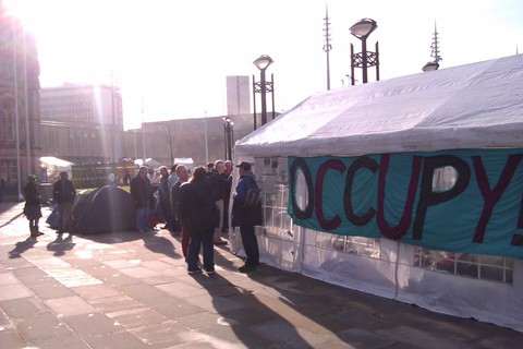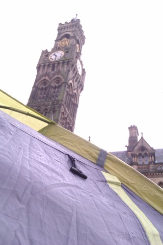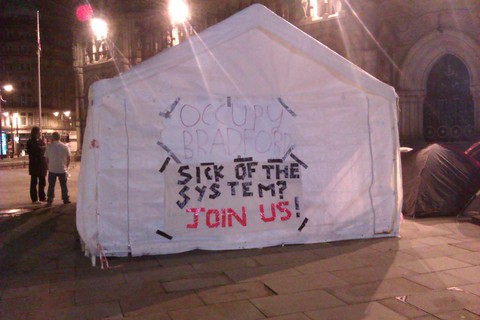 At 1pm on Friday the 28th of October, a small but determined band set up camp in Centenary Square, the social hub of Bradford's town centre. They camped out in the freezing cold and rain, in solidarity with the occupations happening all across the globe, and in disgust at the system which grinds the majority into ever more despair.