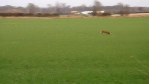 On November 12th we visited the York & Ainsty North for the second time this season, and in many of the same fields & woods as before. We were outnumbered by North Yorkshire police who were itching to make arrests. The hounds were in cry in a wood when a fox (pictured) ran out and across an open field in front of the police, police evidence gatherers (with a camera), the huntsman and sabs. Five sabs ran into the field after the fox had passed and sprayed the area whilst the other sabs sprayed near to the wood. The five sabs were then arrested for aggravated trespass (trespassing to disrupt a lawful activity) but later de-arrested due to the evidence gatherer's footage of the fox! During this time the hounds also ran across the field but they lost the fox's scent and another fox escaped from the opposite side of the wood, where the other group of sabs were able to spray. The arresting officers told us they couldn't police the hunt because they were too tied up with us, and asked "so what exactly is your issue with hunting?"!