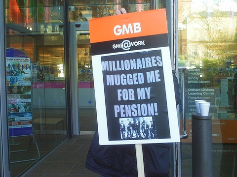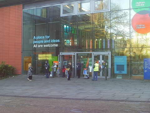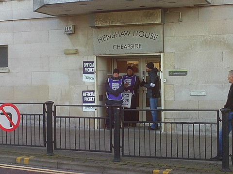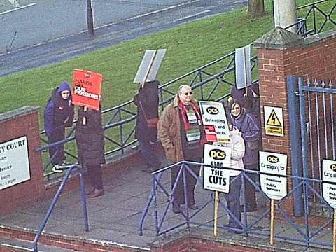 There were pickets outside Henshaw House (local council offices) near the bus station, Oldham County Court, the council car park at Queen Elizabeth Hall, and the central library. The county court stayed open, as it has done during previous industrial disputes, because the judges had turned up to run hearings. Also the security staff and court ushers, although they are members of PCS, are not in a public pension scheme as they are employed by Mitie, a private company.