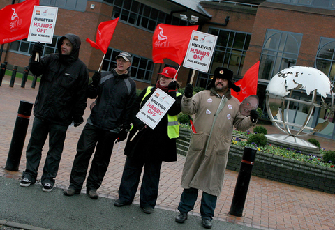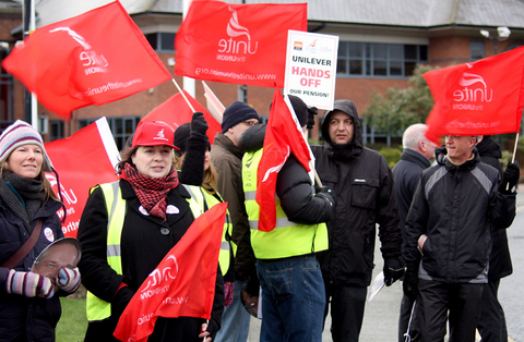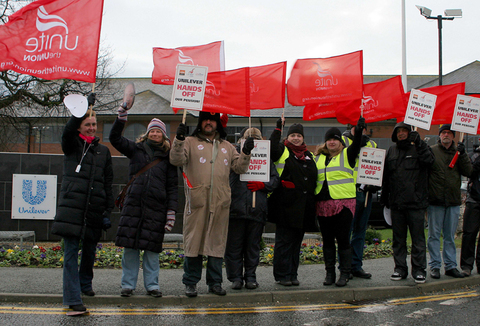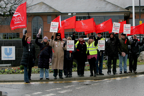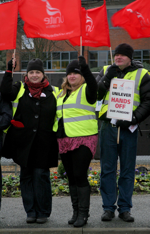 Staff at Unilever IT headquarters at Ewloe, Deeside, N. E. Wales joined workers in action across the UK to strike against the company from 7am today 18/01/2012