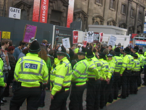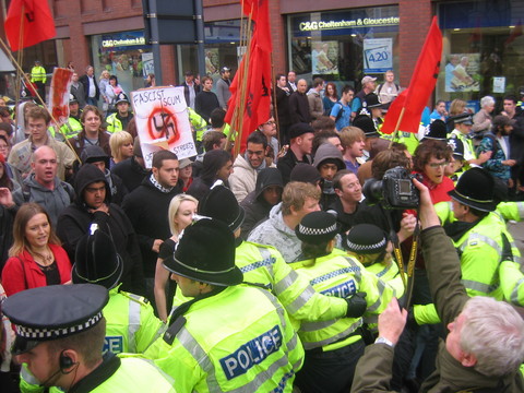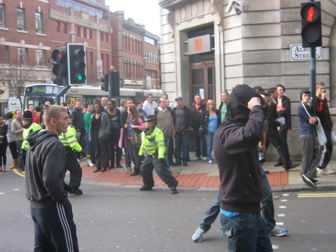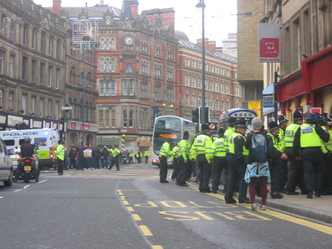 A group of 30 protesters met in Banstead park, Harehills, their ranks swelled by batman and the baby in the batmobile marched down to meet up with 40 waiting protesters from chapeltown. with banners of 'chapeltown against fascism' and 'harehills against fascism' and with a good number of children and friendly faces, they walked into town escorted by police the whole way. they didn't meet up with the massive group of protestors from woodhouse who were in their hundreds. the woodhouse lot were stopped when they reached the headrow, and baited by three youths. Previously a cop confiscated an anti fascism banner, and was followed by a legal observer who asked his number and videod him. UAF tried to goi down the headrow towards the bus station. the police stopped them, and there was a stand off for a couple of minutes until they turned right towards the art gallery, where hundreds more anti fascist protestors waited.