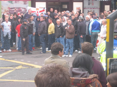 meanwhile, groups lurked the streets, and police directed burly white generally skinhead males towards yates's on boar lane. this is where the group of chapeltown and harehills uaf almost met the edf. shouting and abuse from the edl lot as one of the women from uaf shouted at the cops for allowing the uaf to get so dangerously close and quickly herded uaf protestors back up boar lane then briggate, leaving the edl to shout 'england til i die' and 'edl edl', with a red flag of ulster flying. there were over 150 of them.