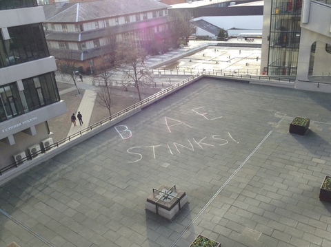 'BAE STINKS!' cried the chalk messaging around campus. Students have kicked up a stink over BAE's attendance at the careers fair. BAE Systems is the second largest arms producer in the world. They have dealt arms with some of the most authoritarian countries in the world (1), such as Saudi Arabia. BAE was also found guilty of corruption by the US Department of Justice in 2010 as a result of fraud involving Saudi Arabia (2). As well as coming under investigation by the Serious Fraud Office over bribery in Tanzania (3).