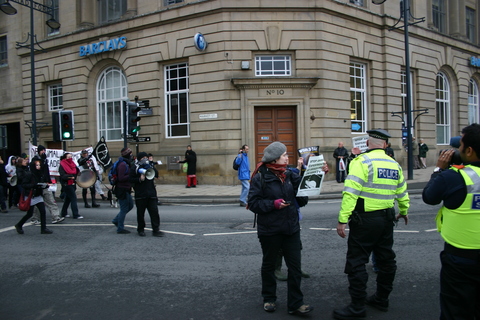 The group congregated in centenary square at 12pm with a rally and then began a march around the city centre at 1pm which moved through the centre to the Broadway development, soon to be Bradfords 'Arts Hole' [5], where two protestors obscured the FIT [Forward Intelligence Team] [6] cameras with posters . Moving up to the Oastler market the protest then went down past TJ Hughes, near here one protestor reported on twitter that they were pushed by police officer number 8333, and then the media museum to make way up Great Horton Road to the main University campus.