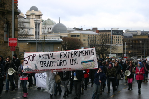 Over 100 people turned out at Bradford University to protest against the animal testing which continues there.