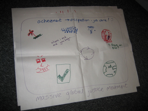 Should there already be a "successful" global justice movement, the job would be done and everyone could relax... But beyond this statement, the emphasis was on empowerment, creativity, and enjoyment, and that really a successful movement would mean better quality of life for all. The importance of experience was discussed and there was also talk about recognising different components, things like access to land and housing, affordable and small scale clean energy, education and ways to share skills and knowledge, local food production, and so on. These resources, or movements, have fluid boundaries and connections. What could form the substance of these connections? It seemed that this meeting was already fulfilling one of the critical functions of opening up public space for people to engage in these conversations in the first place.