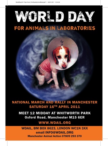 On Saturday April 16th 2011 campaigners from across the country will be gathering in Manchester to mark World Day for Animals in Laboratories, a UN recognised date to remember the many millions of animals worldwide who are tortured and killed in experiments each year.
