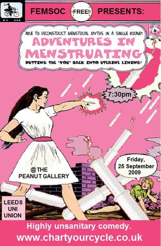 We think menstruation is funny. This is why we write about it, talk about it and make up smutty jokes about it. Then we laugh. A lot. Why is menstruation funny? Um...for the same reasons a lot of other stuff is funny. It's a taboo subject - the shock of it all always gets a giggle right away and, immature or not, the gross-out factor is still fun. It's the new fart joke. You wait and see. Laughter is therapeutic - sometimes periods are a pain in the uterus. Observational humour ain't all bad, and that moment of recognition feels good. We like that shared experience thing. Comedy as subversion is addictive - once you start undermining those stereotypes and analysing the euphemisms, you just can't stop. Menstruation has historically, socially and culturally been cloaked in fear and shame. Deconstructing these beliefs, with brute force when necessary, is empowering. Oh yeah - all our stuff is for menstruators and non-menstruators alike.