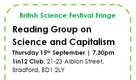 As the British Science Festival visits Bradford we will be holding a reading group on the subject of science and capitalism. You are welcome to read anything on the subject, we will then share what we have read and use that as a starting point for an informal group discussion.