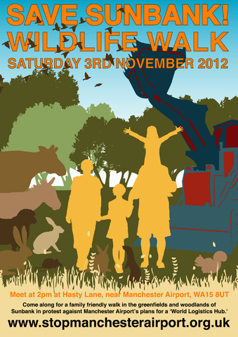 Come along for a family friendly walk in the greenfields and woodlands of Sunbank in protest against Manchester Airport’s plans for a ‘World Logistics Hub’.