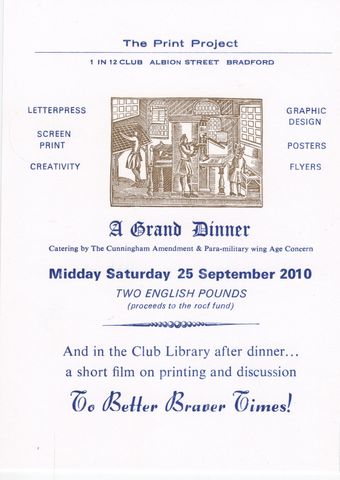 From noon on 25th September, a Grand Dinner hosted by The Cunningham Amendment and the Paramilitary wing of Age Concern, celebrating the inauguration of the 1in12 Print Project letterpress.