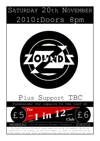 Following their successful European tour, the legendary 80's anarcho-pop-punk band Zounds are playing at the 1in12 Club, Bradford as a fundraiser for urgent repairs to the Roof of the building. Playing a mix of old and new songs and with support acts to be confirmed soon. This will be followed by a punk disco and all manner of Buckfast fuelled shenanigans.